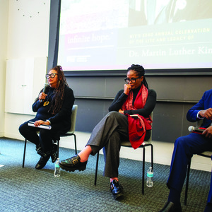Moderator RaeVaughn Gardner-Williams (left) and panelists L'Merchie Frazier, D’jamila Ribeiro, and Dr. Patrick Njoroge discuss the legacy and impact of Dr. Martin Luther King Jr. at MIT on Thursday, Feb. 5, 2026.