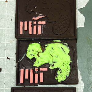 Chocolate designs of MIT, molded by students in the MIT Laboratory of Chocolate Science.