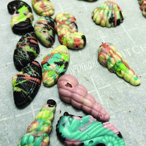 Chocolate shells with varying designs, created by students in the MIT Laboratory for Chocolate Science.